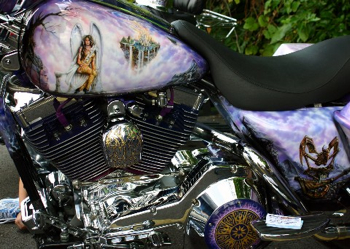 chrome-plated motorcycle engine with painting of girl